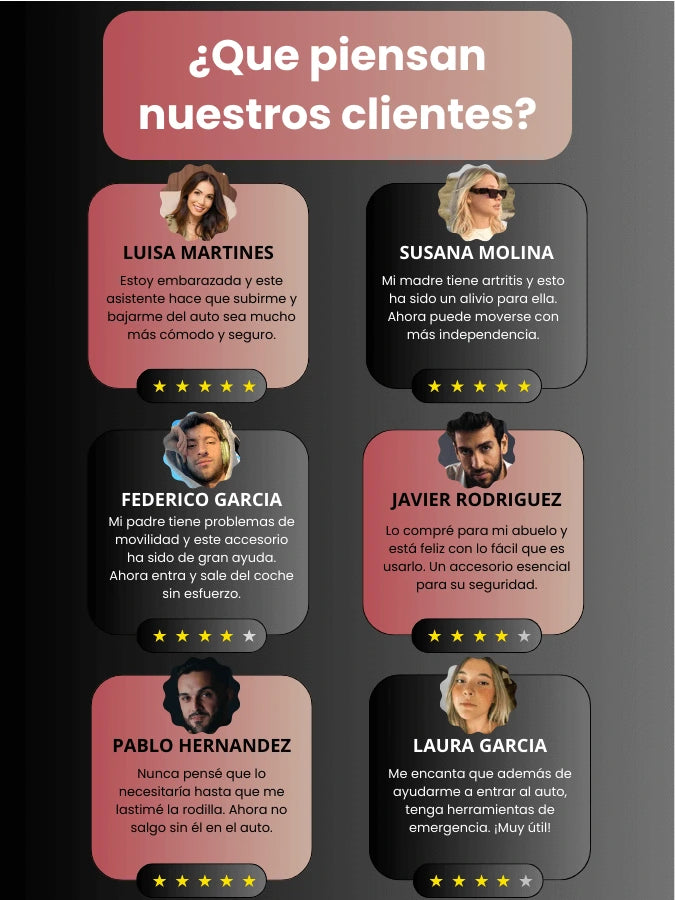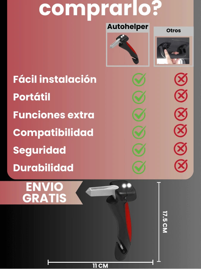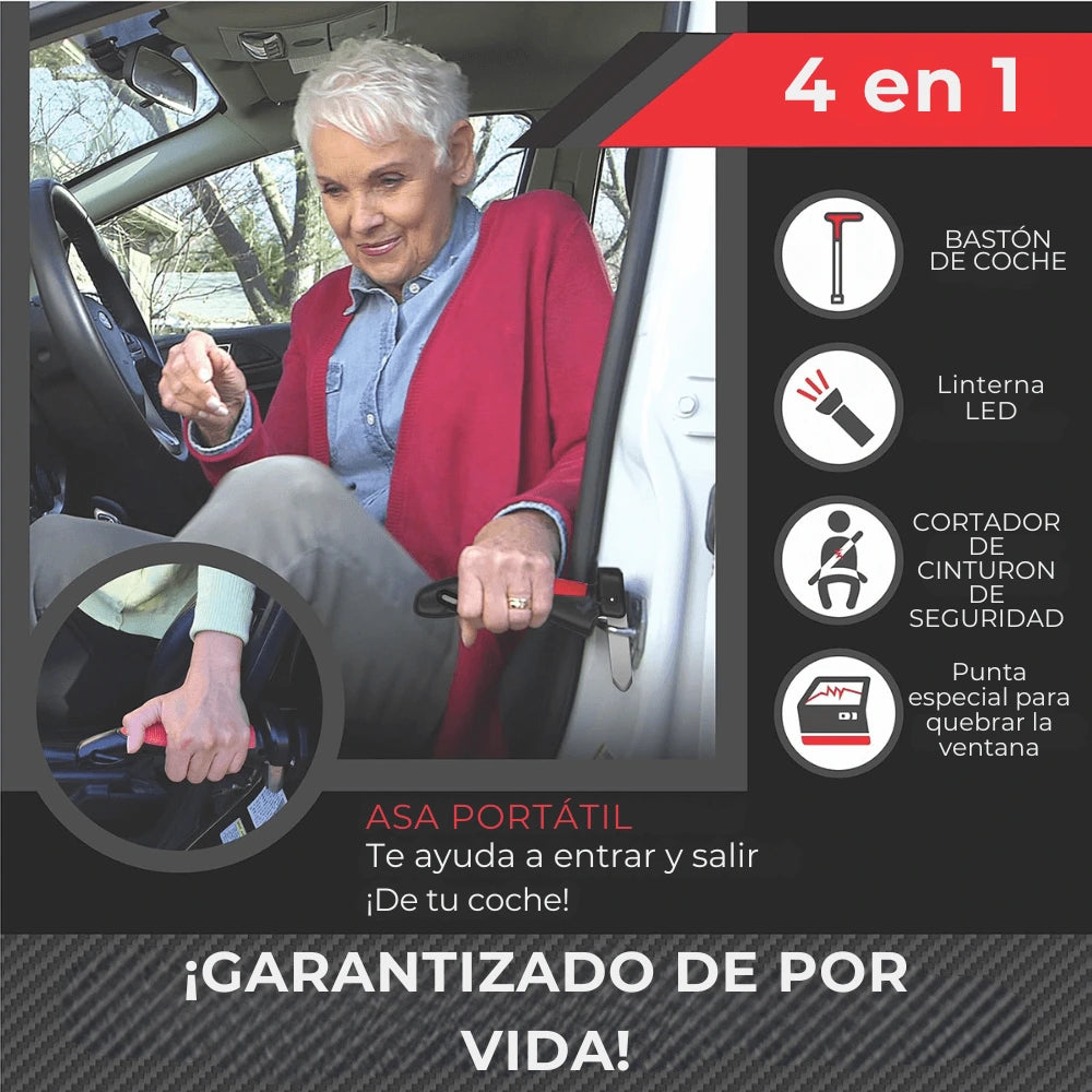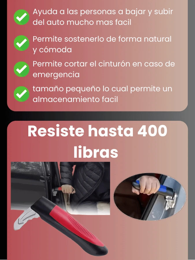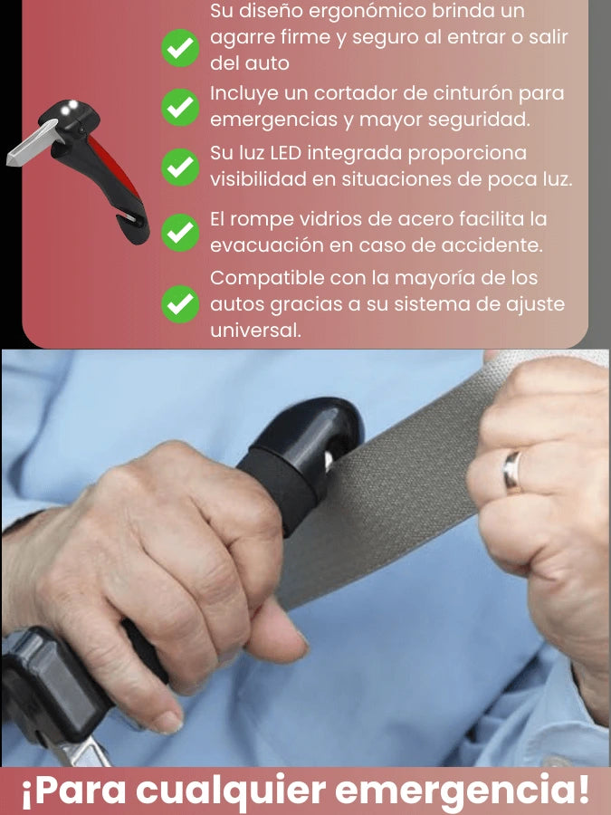 Además de brindar apoyo al entrar y salir del auto, incluye cortador de cinturón de seguridad, rompe vidrios y luz LED para emergencias.