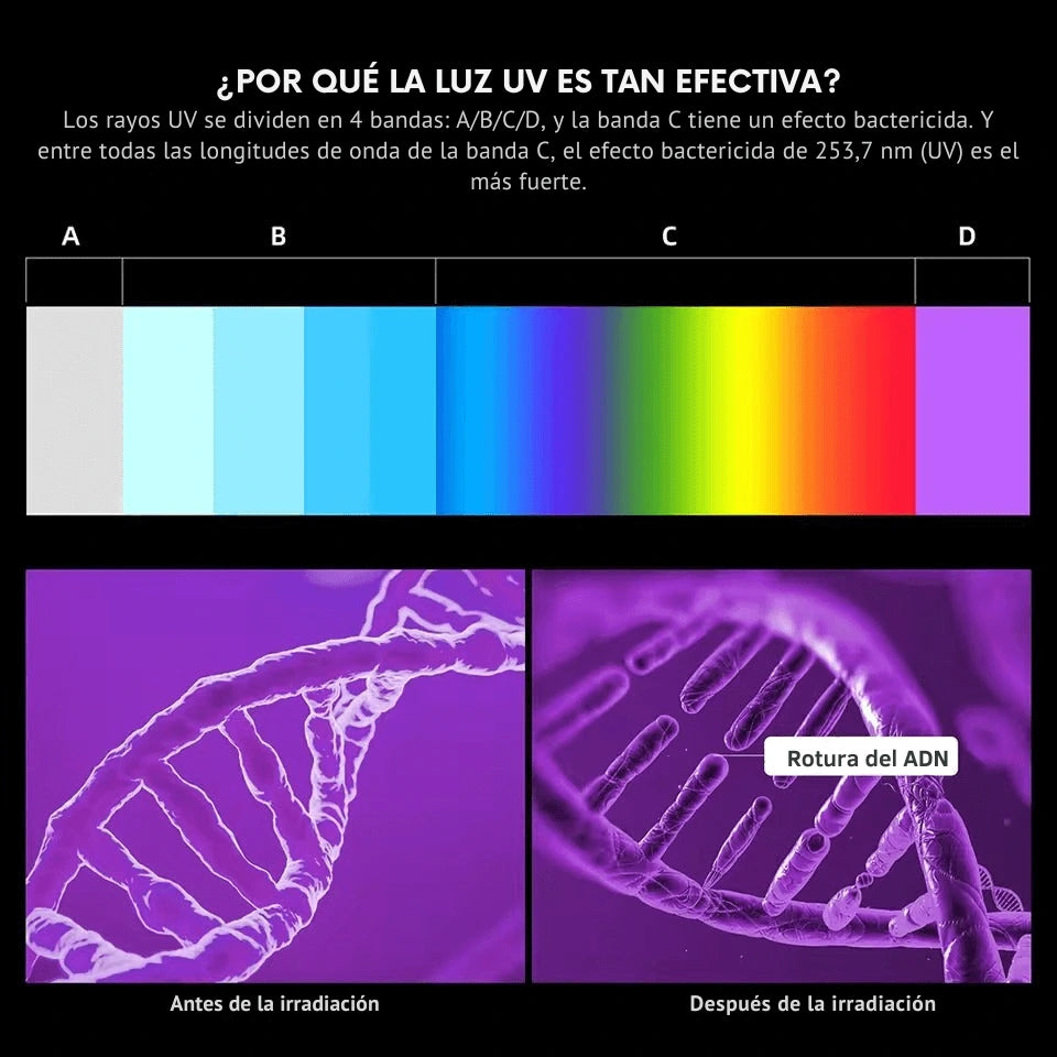 La radiación UV-C destruye el ADN de los microorganismos, eliminando el 99.9% de virus, bacterias y gérmenes en minutos.