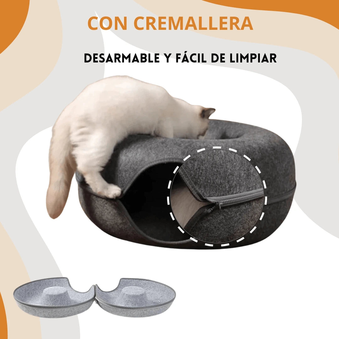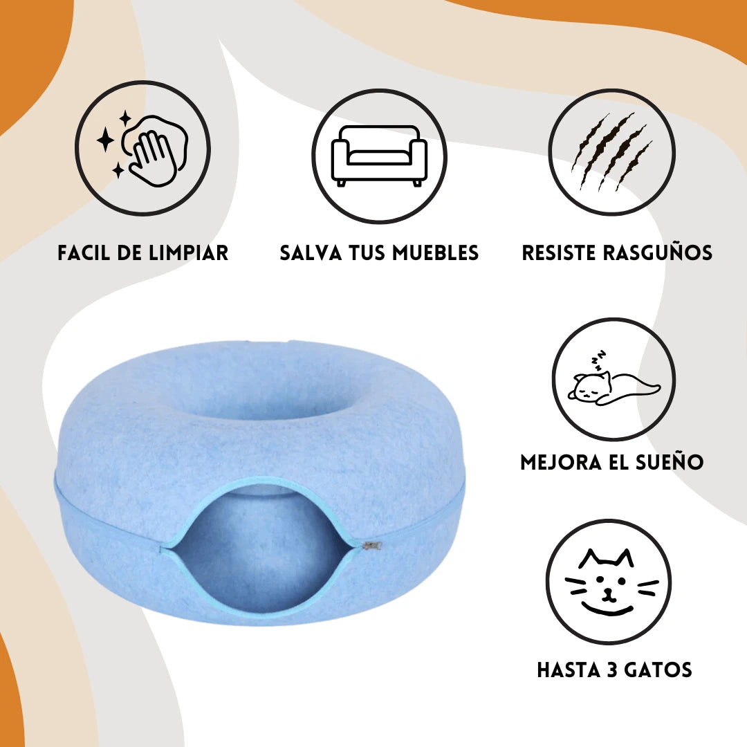 Miauzone® combina una cueva, túnel y una cama para gatos en un solo producto, lo que permite que varios gatos lo usen, jueguen, y duerman juntos