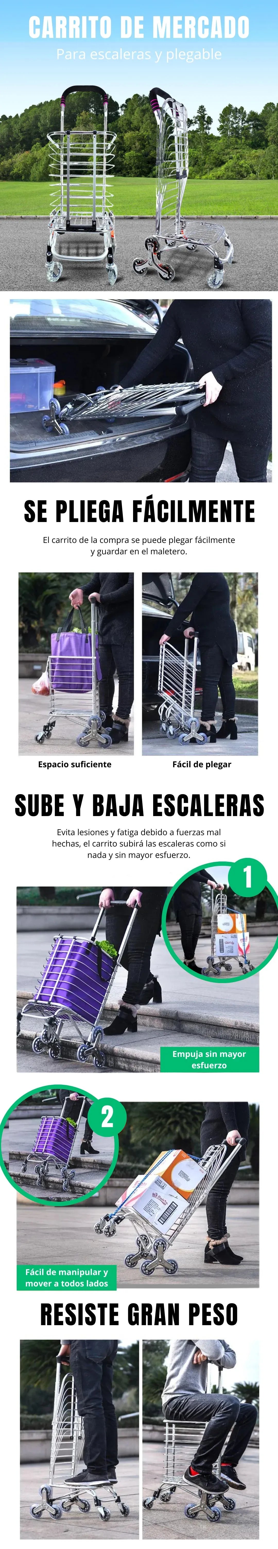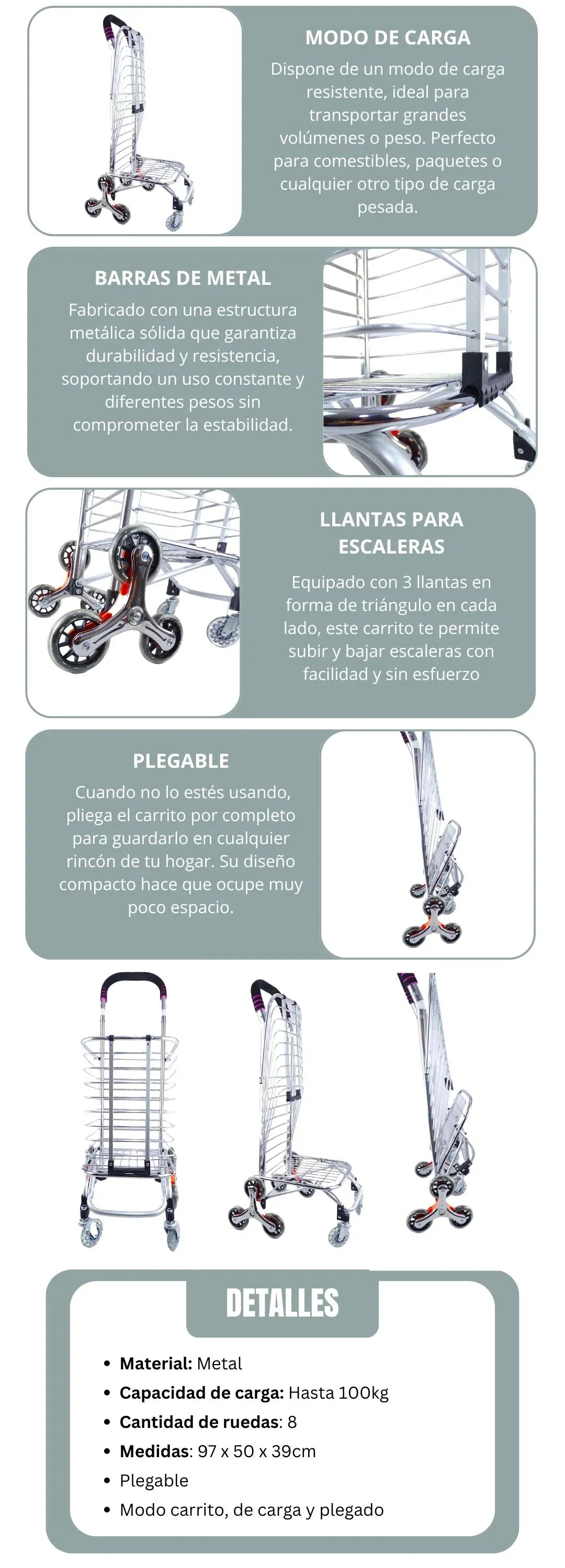 Su diseño de tres ruedas giratorias permite subir y bajar escaleras con mínimo esfuerzo. Se adapta a bordillos, aceras y desniveles sin problema.