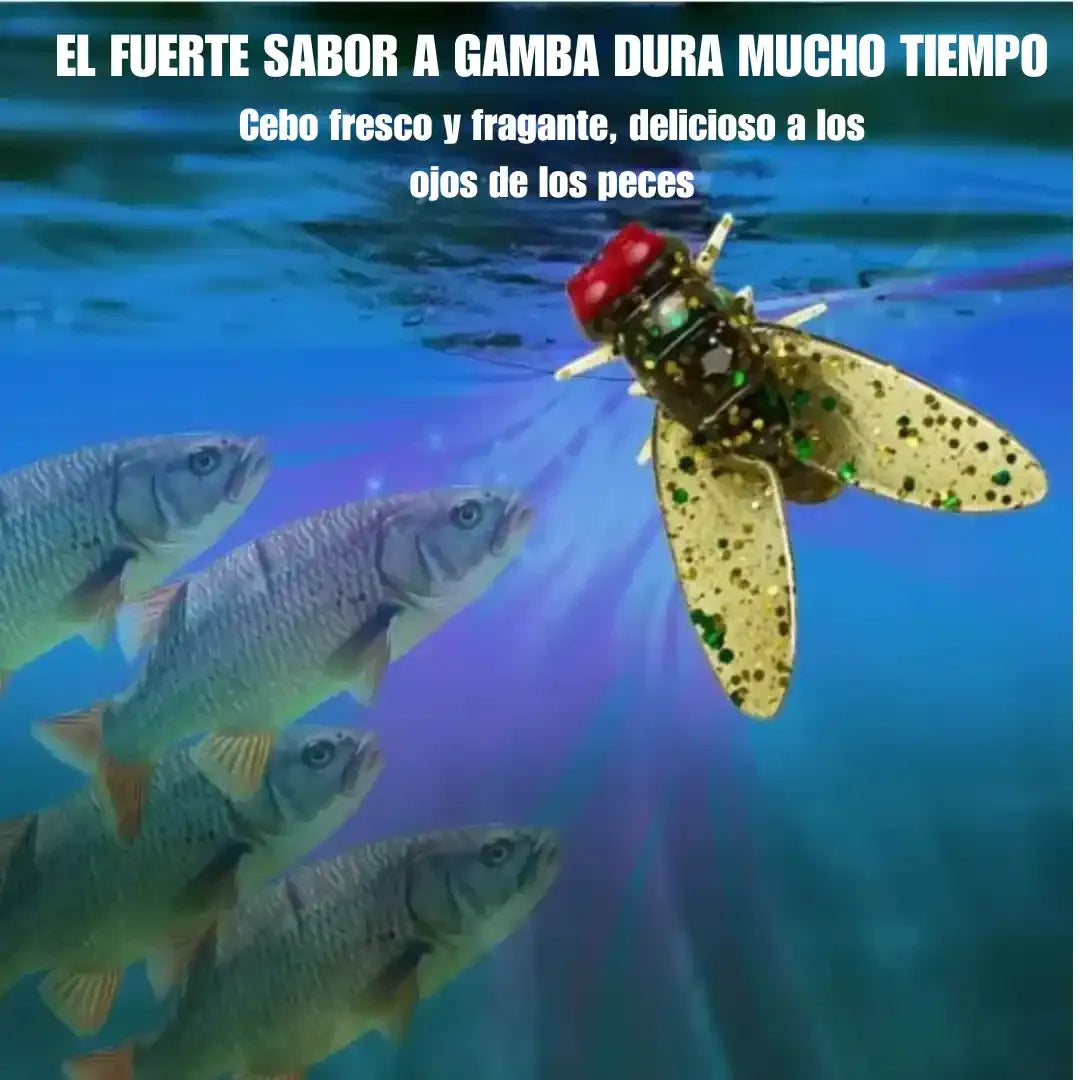 Su diseño imita a una mosca real en movimiento, atrayendo peces con su apariencia y reflejos naturales.