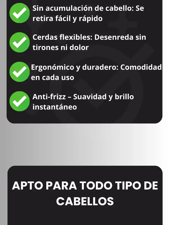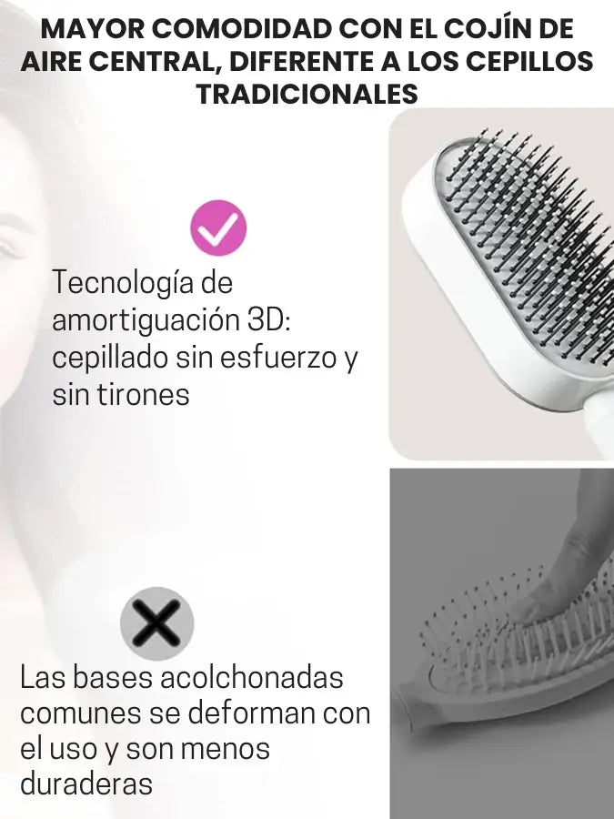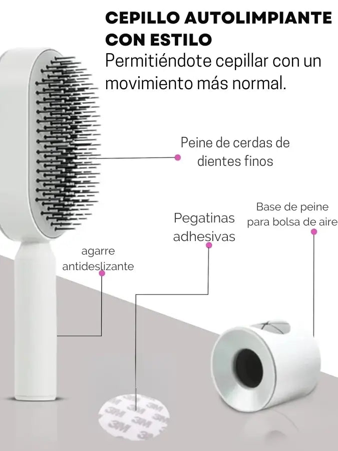 Este cepillo cuenta con un diseño autolimpiante que facilita la higiene y el mantenimiento. Además, sus cerdas están diseñadas para desenredar el cabello sin causar daño, y su base proporciona un soporte estable durante su uso.