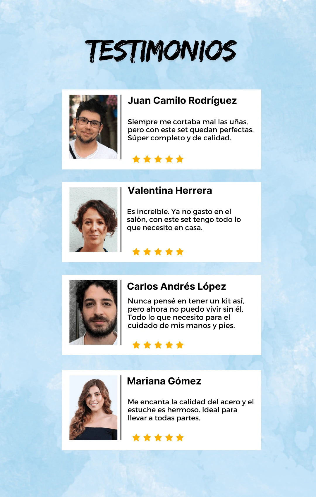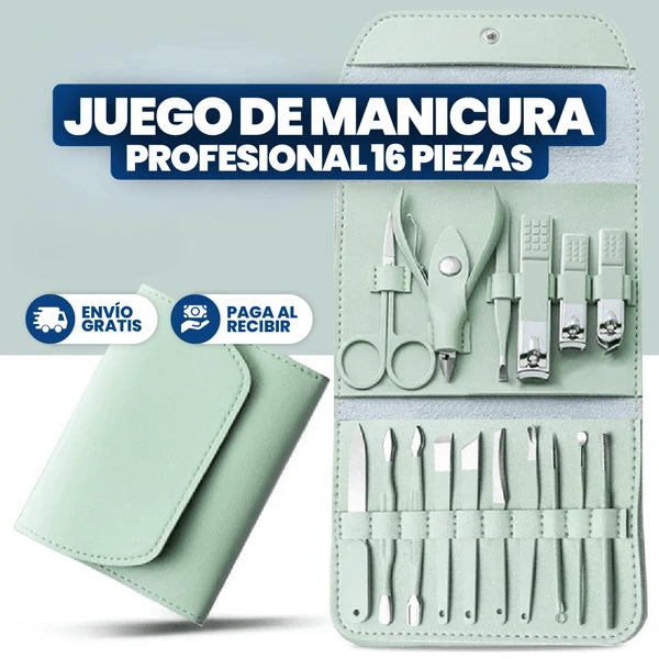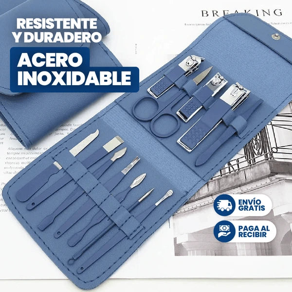 Incluye cortaúñas, tijeras, pinzas, empujadores de cutícula y más herramientas de acero inoxidable para el cuidado completo de uñas y piel.