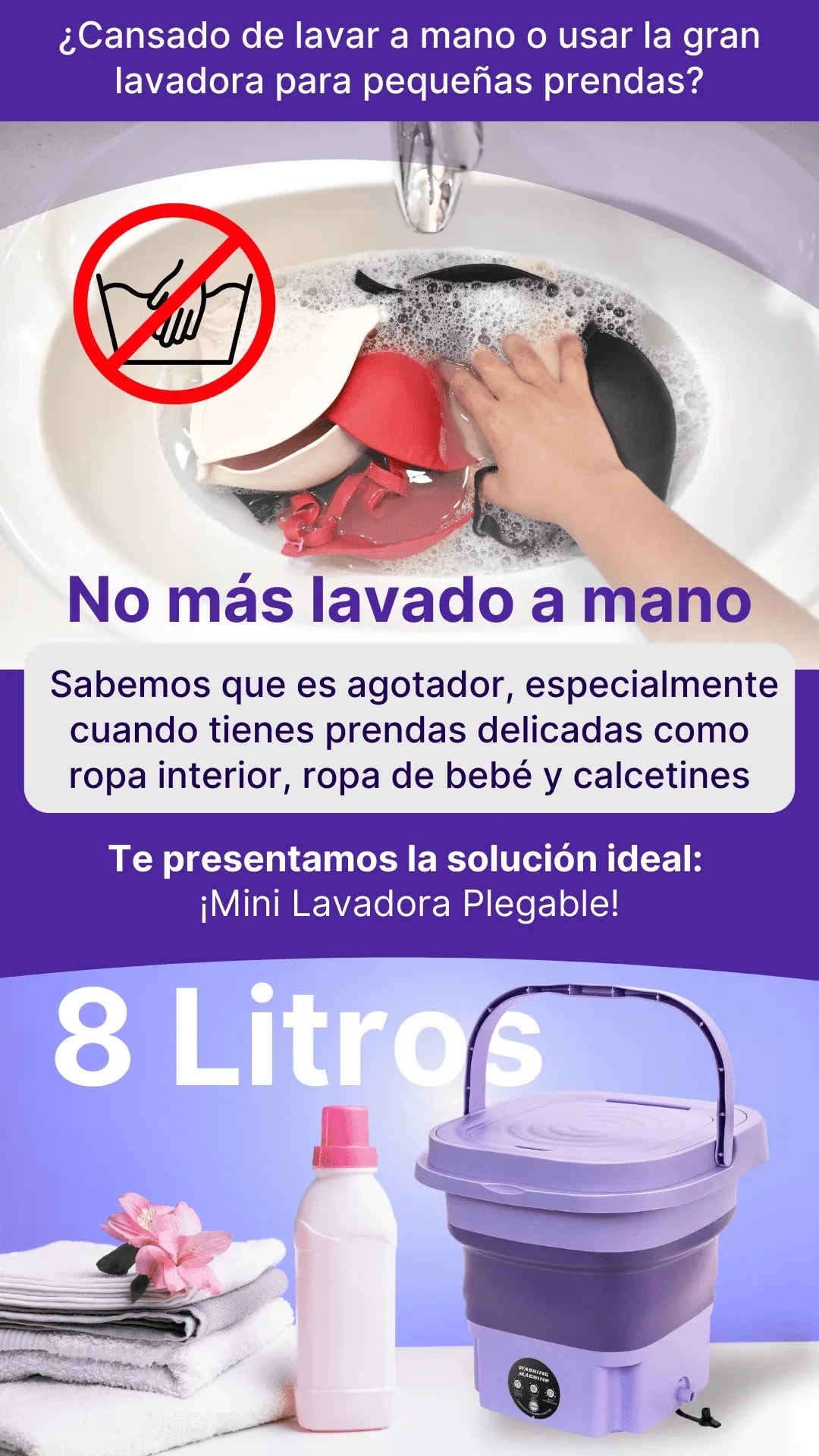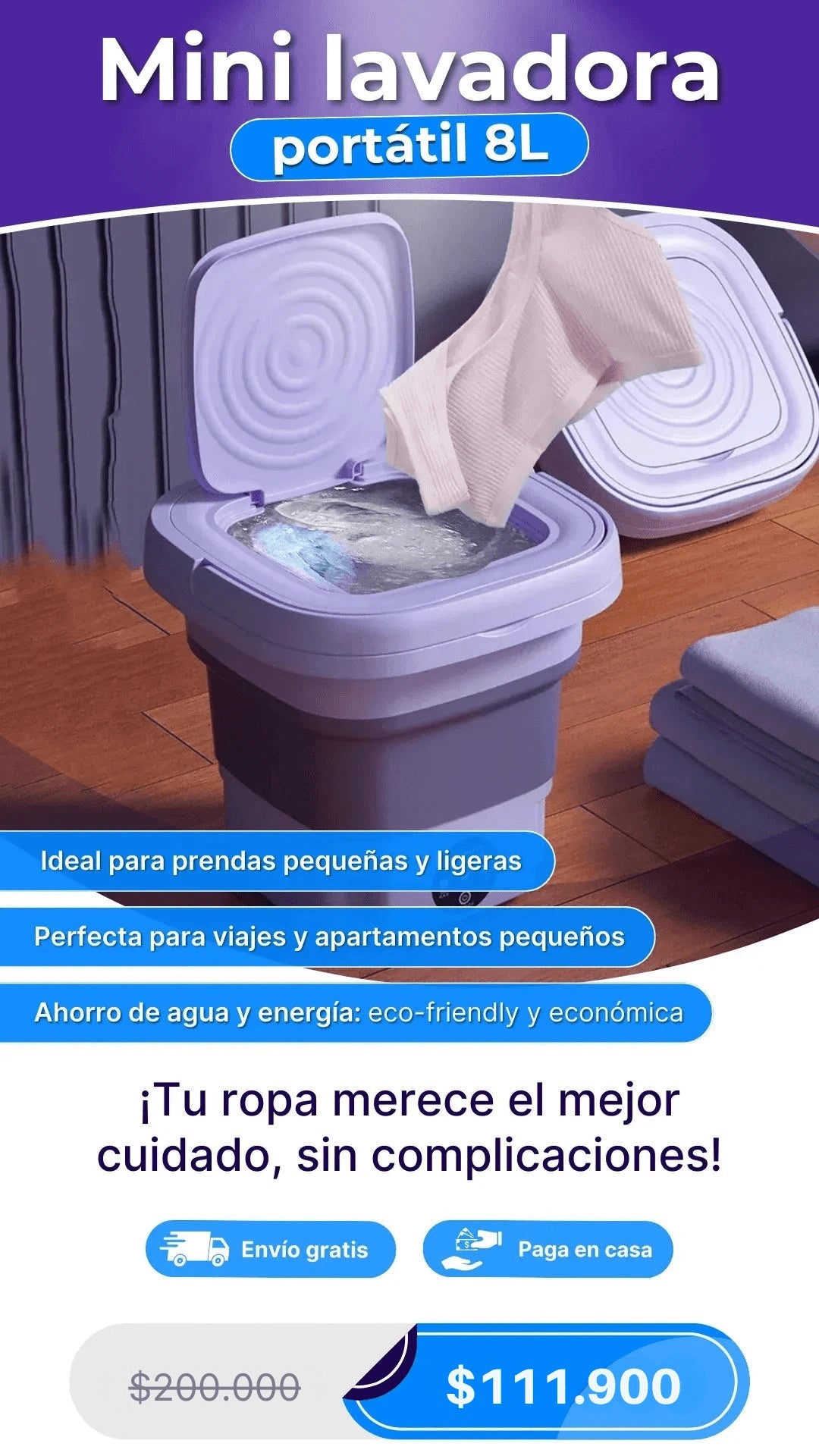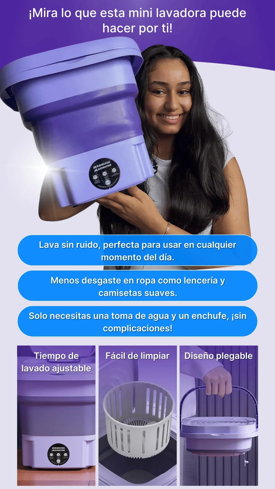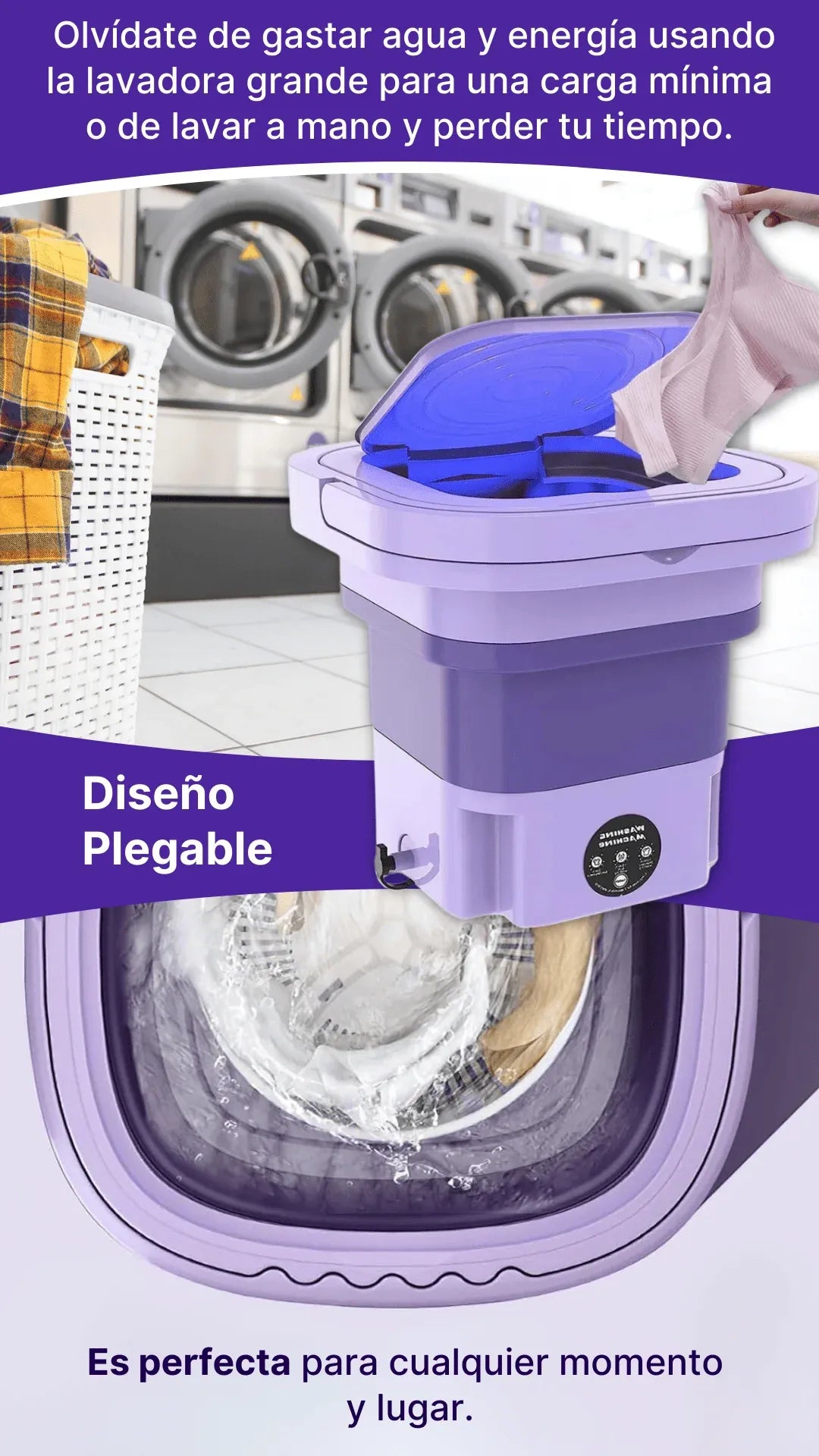 Solo agregas agua, detergente y la ropa, la conectas a una fuente de energía y en minutos tu ropa estará limpia.
