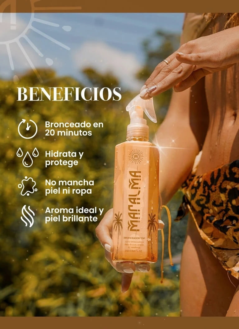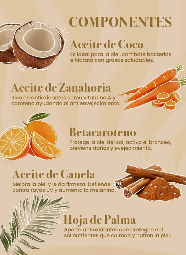 Es un bronceador natural formulado con ingredientes como aceite de coco, canela y zanahoria, diseñado para proporcionar un bronceado rápido y saludable sin químicos innecesarios.