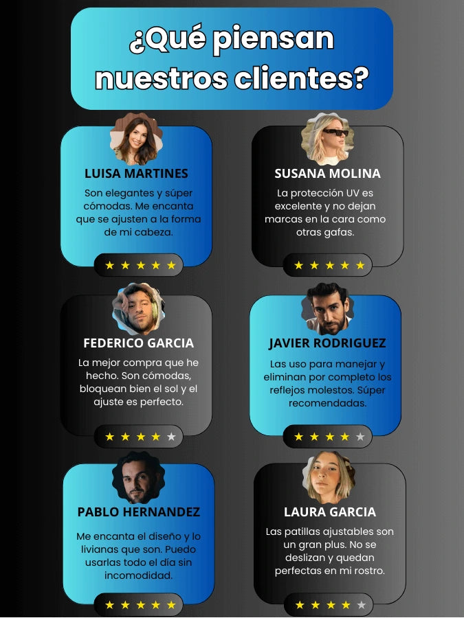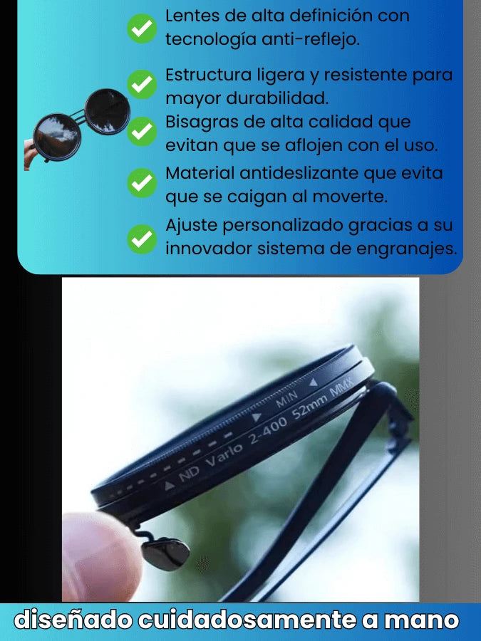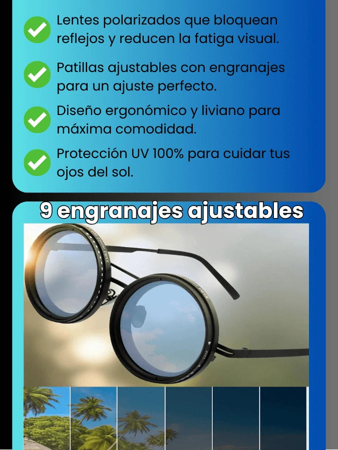 Cuentan con lentes polarizados que reducen el deslumbramiento y mejoran la visión en exteriores. Además, tienen patillas ajustables con engranajes para un ajuste cómodo y seguro.